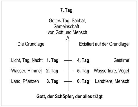 Als Gott an den ersten 3 Tagen das Licht von der Nacht schied, den Himmel und das Wasser trennte und das Land mit den Pflanzen hervorbrachte, da schuf Er damit die Grundlagen und Lebensräume für die nächsten 3 Tage. Der 1. Tag war die Grundlage für den 4. Tag, an dem Gott Tag und Nacht mit den Gestirnen füllte, der 2. Tag war die Grundlage für den 5. Tag, an dem Er die Gewässer mit Lebewesen und den Himmel mit Vögeln erfüllte, und der 3. Tag war die Grundlage für den 6. Tag, an dem Er das Festland mit den Landtieren bevölkerte und den Menschen aus der Erde formte. Sie alle leben und existieren auf den Grundlagen, die Er zuvor geschaffen hat, so wie Er selbst als unser Schöpfer die Lebensgrundlage ist, die alles trägt. Mit dem 7. Tag als Vollendung fasste Er schließlich alles zusammen, indem Er, der Schöpfer, sich selbst schenkte, um mit den Menschen zusammen zu sein, um mit ihnen vereint zu sein. Das ist der Höhepunkt.