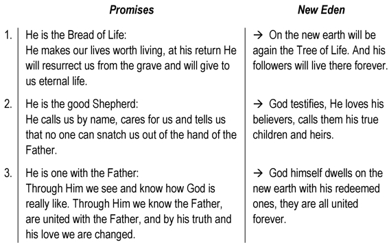 But much more: In his promises Jesus reaches from Eden to the new Eden by showing us, how He can renew us, and how in the future He will finally restore the original state. (s. Jn 6:35-63; 10:1-30; 17; Rev 1:5; 21; 22).