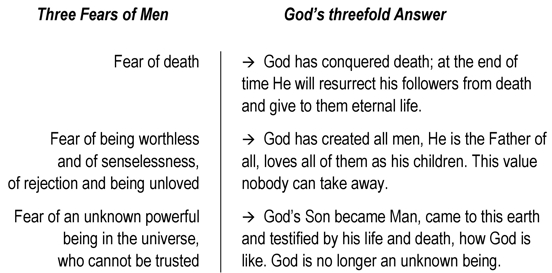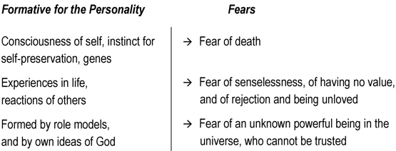 These three fears can be compared with the three components that mainly form and mold the personality of a man – the own ego, the experiences in life, and the role models and the ideas of God. All three of them were adversely affected by the Fall of Man, and thus led to the three fears.