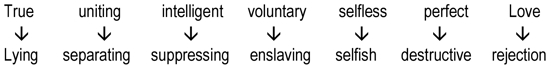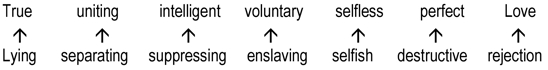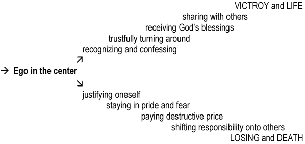 The love described here portrays God’s character and principle. His kind of love is the highest principle. There is no better or higher principle. This means if one moves away from this principle to a different norm, one can never go up and reach a higher level or knowledge, as Satan claimed at the tree (“your eyes will be opened and you will be like God”). Another standard does not even remain at the same level of this highest principle. Even if one deviates by half a degree, one moves inevitably downwards, and his character changes to the negative. This process may be slow and not immediately identifiable. But in the example of the first people we can see that after their fall their selfless character had changed after a short time, so that they pushed the responsibility for their deed onto others, and they were afraid. Therefore moving away from God’s principle is always a way down, as the arrows show. This is the logical, inescapable consequence.