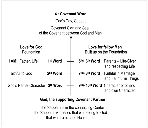 And as in the creation days also in the 10 Covenant Words we can find a meaningful order, for the first 3 Covenant Words complement the other 3 pairs of Covenant Words. The first 3, again, provide the foundation, on which the last 3 pairs are built on, since through the first Covenant Words God can help us to learn to keep the others as well. And the Sabbath, the 7th Day, is here in the connecting center. It connects the Covenant Words about God with the Covenant Words about our fellow men.